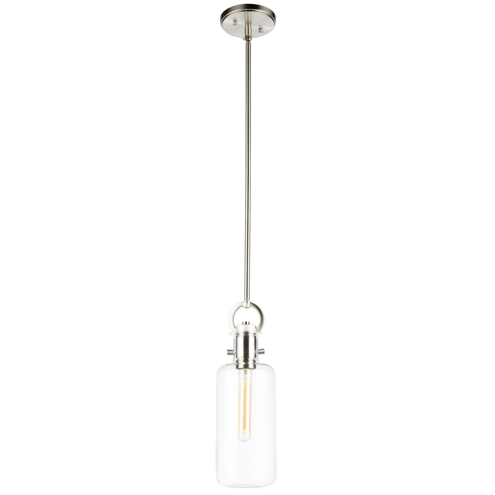 DESCRIPTION : Single pendant with clear short wide cylinder glassware on a satin nickel frame.