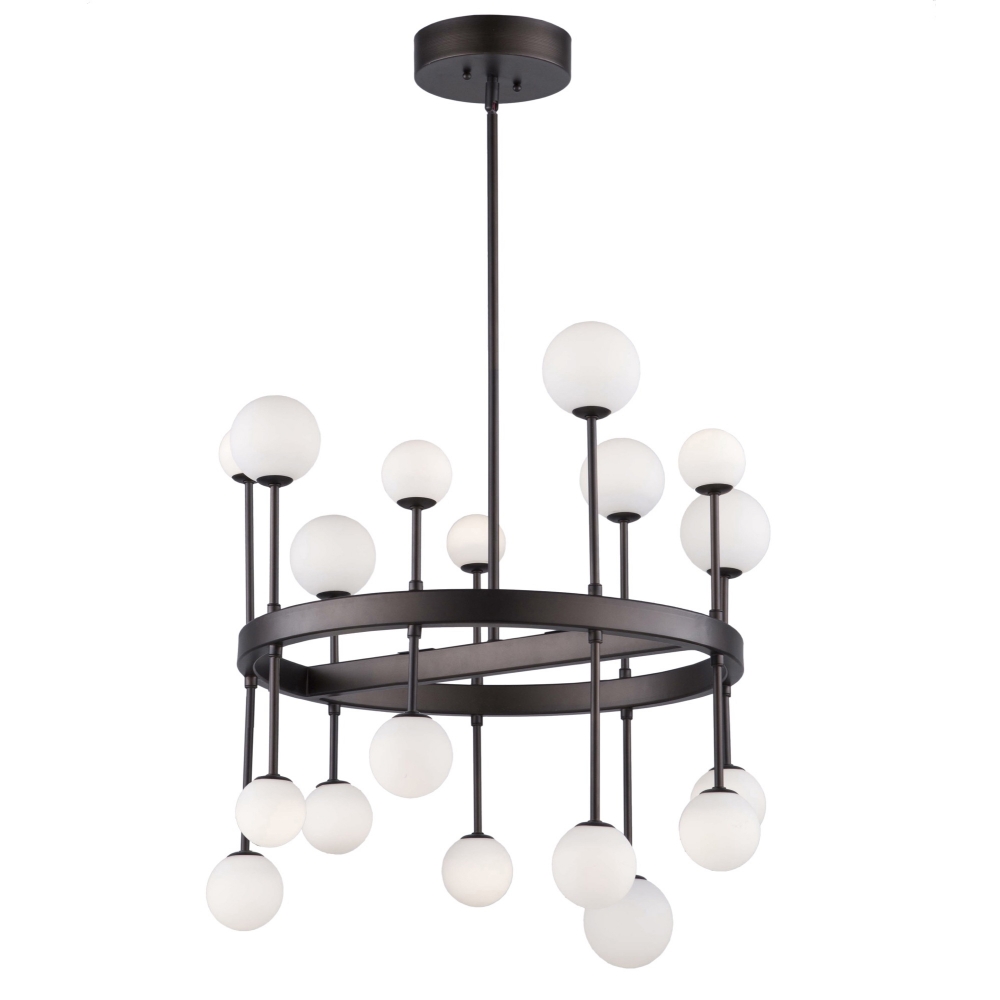 DESCRIPTION : The Melrose collection has a circular rich bronze frame which showcases its sphere shaped opal white glassware which is illuminated by bright LEDs. This model is energy efficient. 18 light chandelier model shown. View all chandelier lighting options here.
