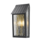 The Point collection outdoor wall sconce exudes both contemporary flair and classic allure. Its bold black frame contrasts beautifully with the warm glow of the interior brass backplate, while the rain-textured glass mimics cascading droplets, casting a soft, inviting light. Perfect for any outdoor setting, it offers both style and warmth.