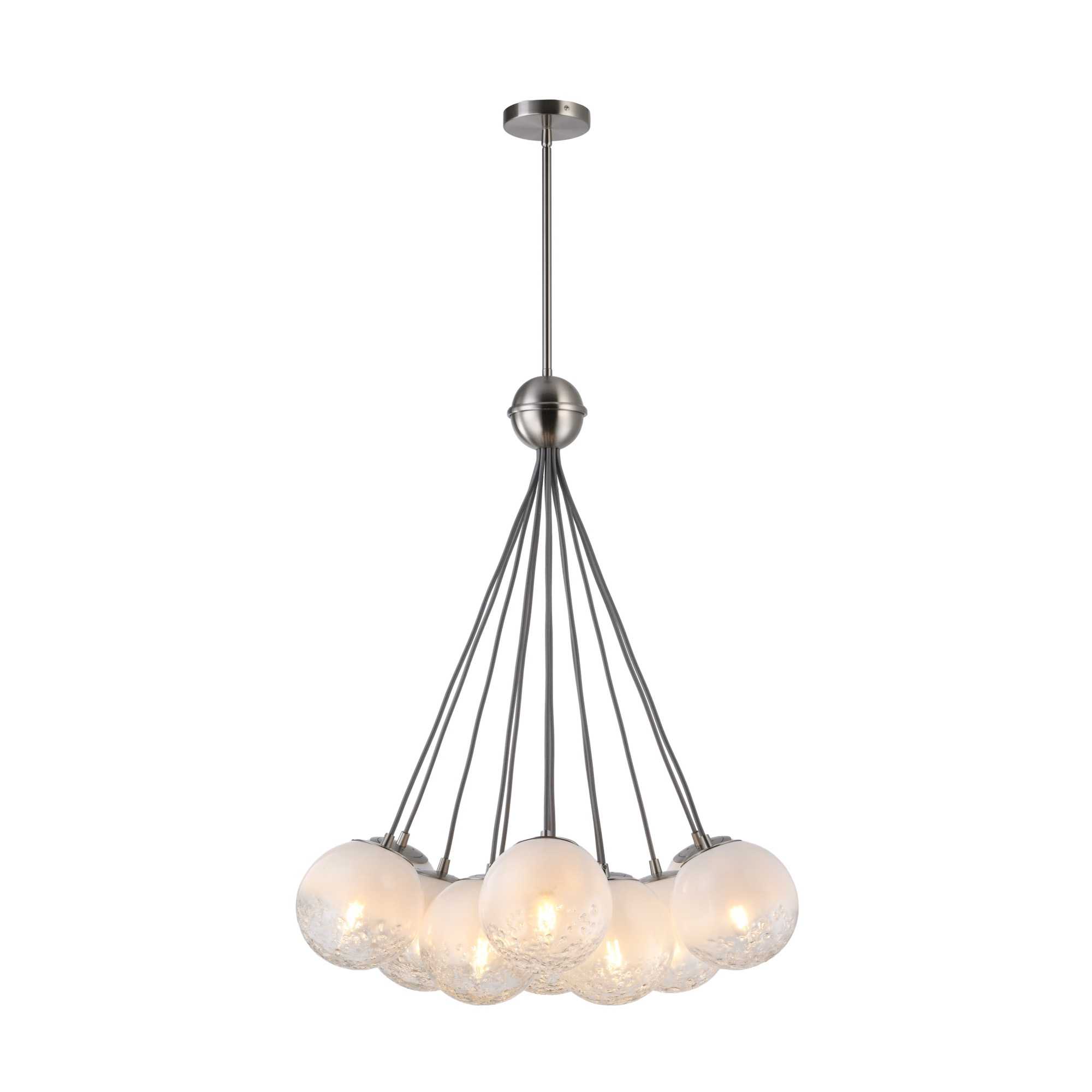 The Moonlight collection features this stunning 12-light chandelier, which creates an ethereal glow reminiscent of a night sky. Each glass globe showcases a beautiful ombre effect, transitioning from a solid white top to a moon-textured clear bottom. These artistic spheres are elegantly suspended from a plated satin nickel frame, providing a clean and contemporary contrast to the organic glass. This sophisticated fixture serves as a brilliant focal point, perfectly blending modern metallic finishes with unique, artisanal textures. Great for a kitchen or dining room area.