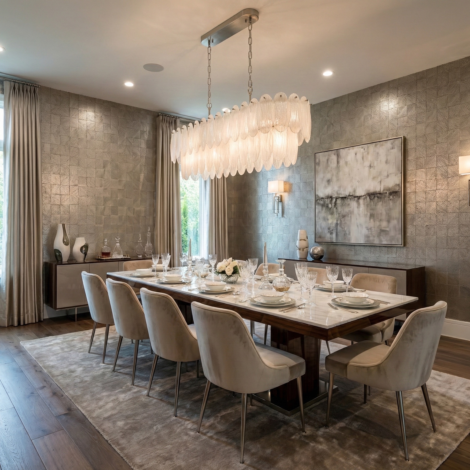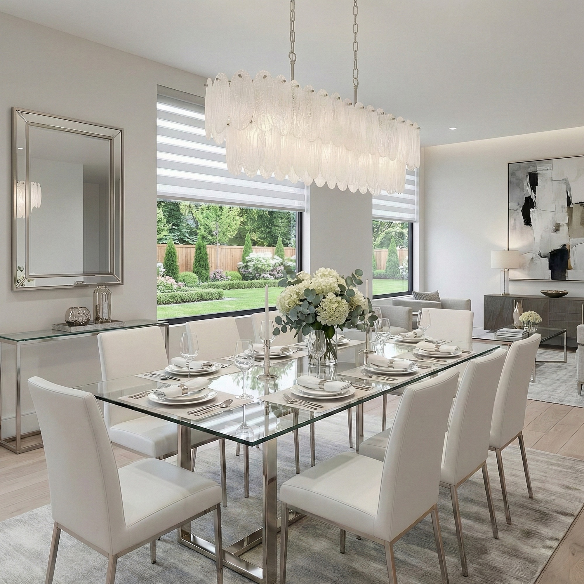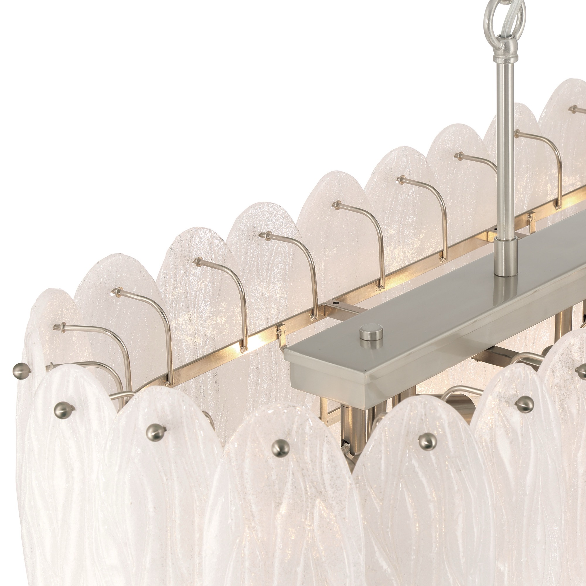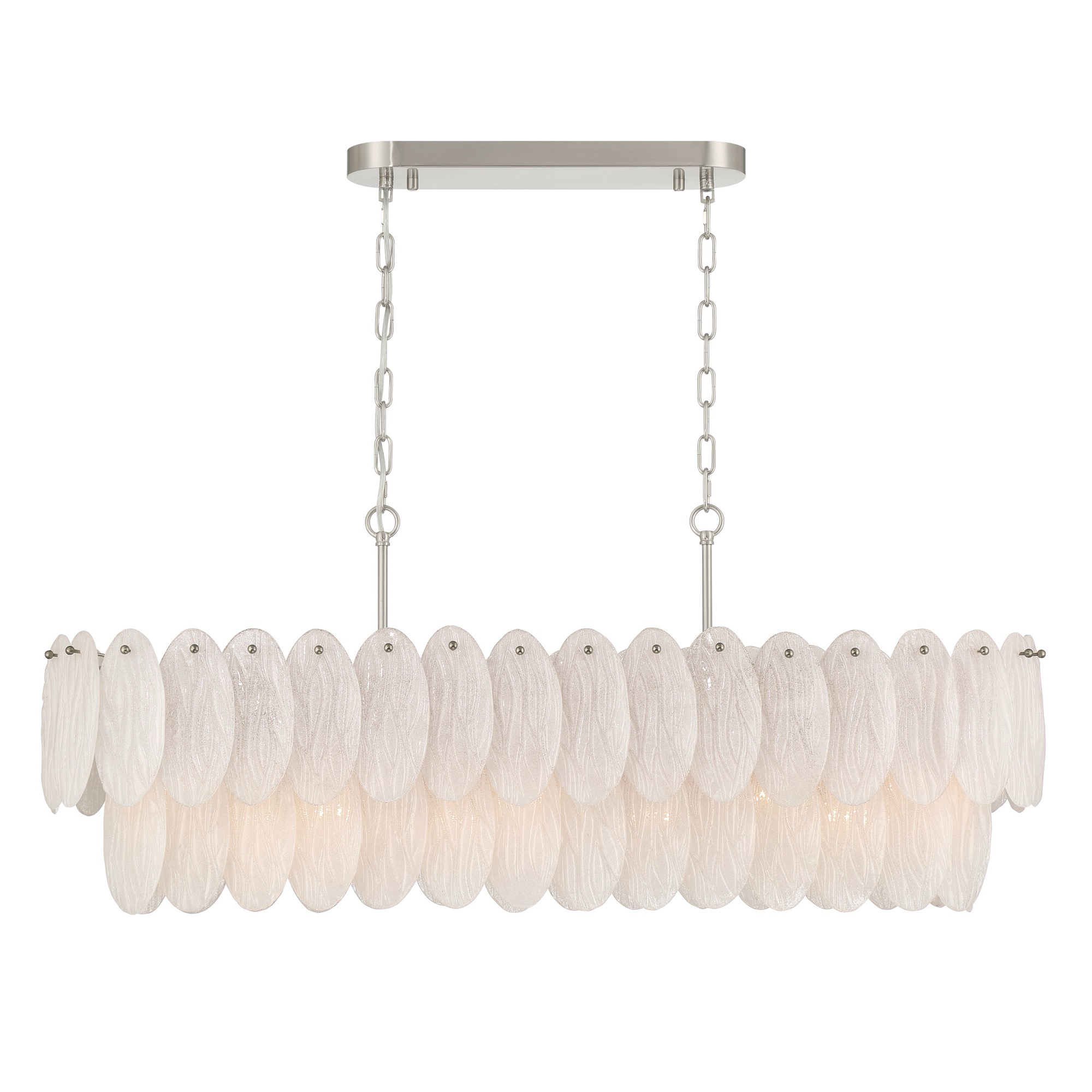 The Serena collection features this magnificent 43.5" linear island chandelier, designed to serve as a luxurious statement piece for a dining room or kitchen. The fixture is distinguished by its cascading tiers of organic-style white sparkly etched pendalogue glass, which beautifully catch and refract light for a dazzling effect. Its robust frame and supporting hardware are expertly plated in satin nickel, offering a refined and contemporary finish.