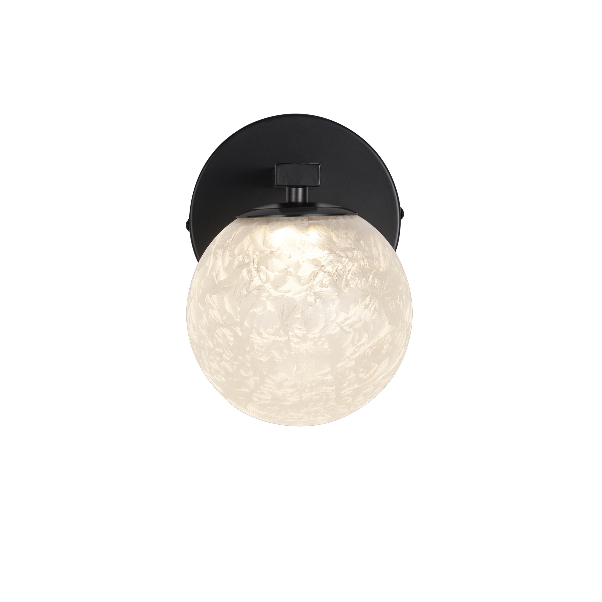The Forma collection features this elegant LED wall sconce, showcasing a stunning globe of "Ice Glassware" that provides a brilliant, crystalline glow. This artisanal glass is beautifully supported by a modern bold black frame, offering a clean and sophisticated aesthetic for any interior. For ultimate versatility, this model is 3CCT enabled, allowing you to select the perfect color temperature to suit the mood of your home. Its sleek and durable design makes it an ideal lighting solution that can be used in bathrooms and hallways alike.