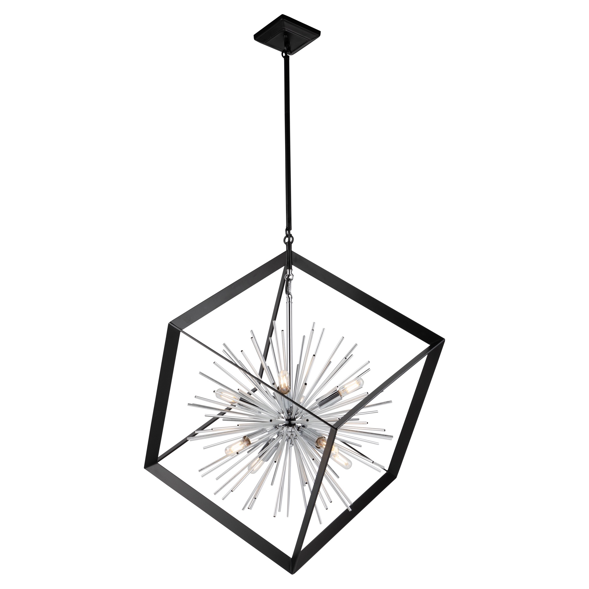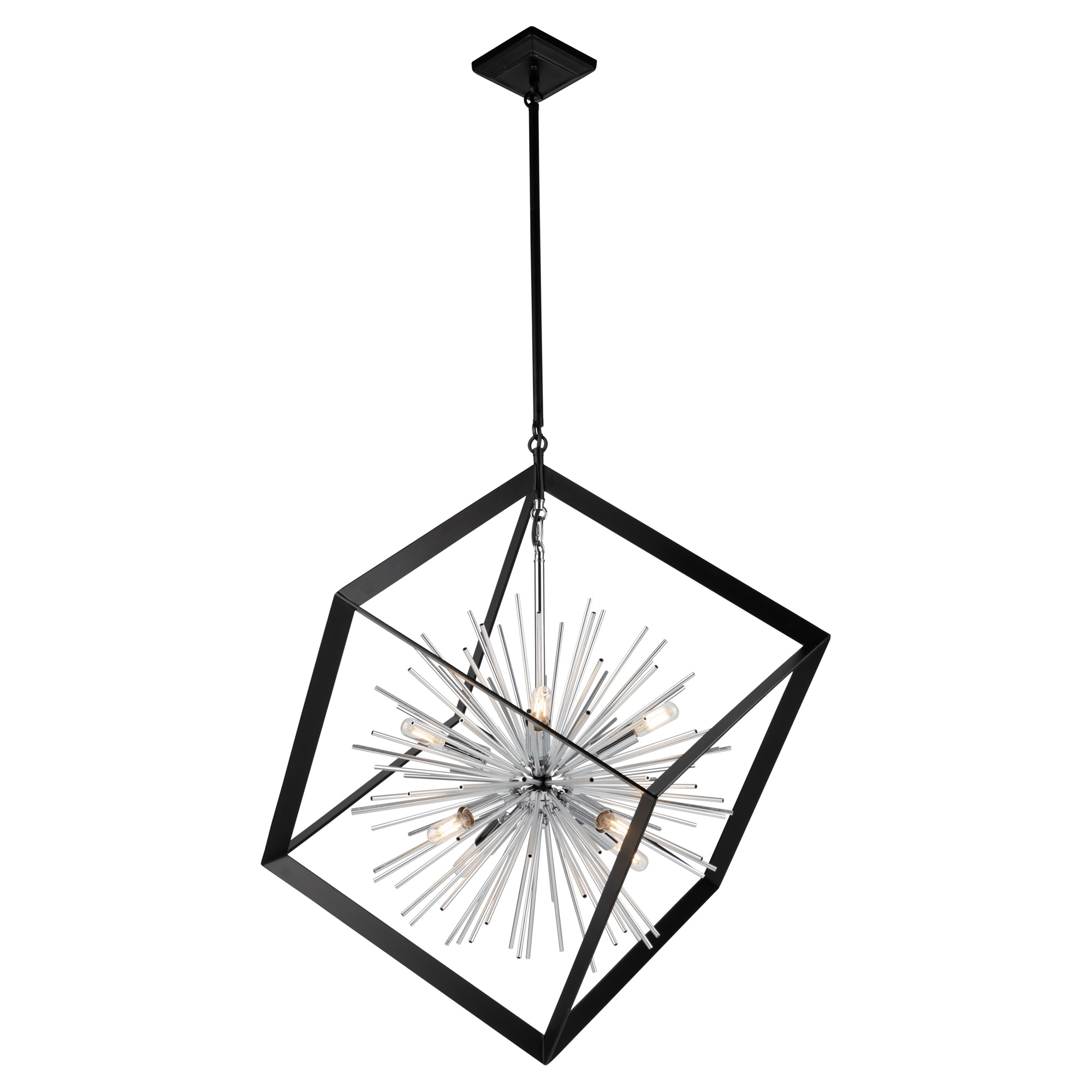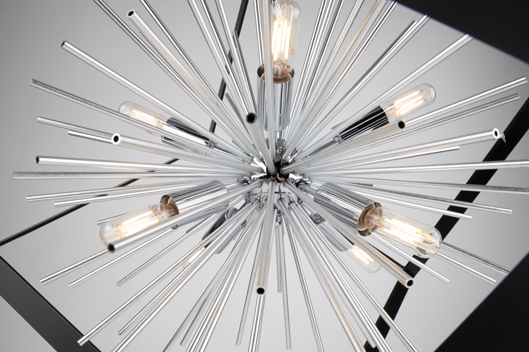 DESCRIPTION : The Sunburst Collection chandelier is unique and a definitely beautiful focal point. The exterior frame is matte black encasing aluminum color thin hollow rods attached to a chrome center. (also available with satin brass interior cluster). 8 light shown