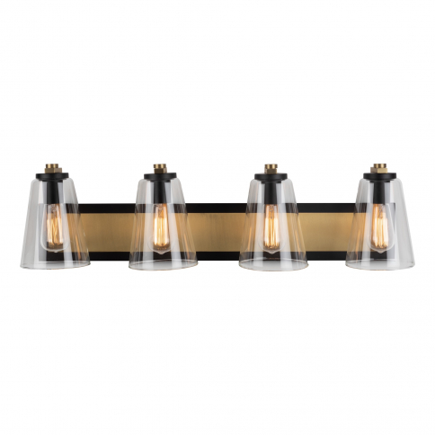 The Treviso collection by designer Kevin Kraemer is a perfect addition to any vanity area. This series features clear cone shaped glassware and is complimented with a black frame and brass accents. It almost appears at the holder has the bulb floating within. Four lite version shown but available as a single sconce or 3 lite as well.