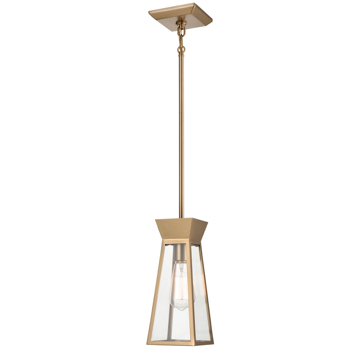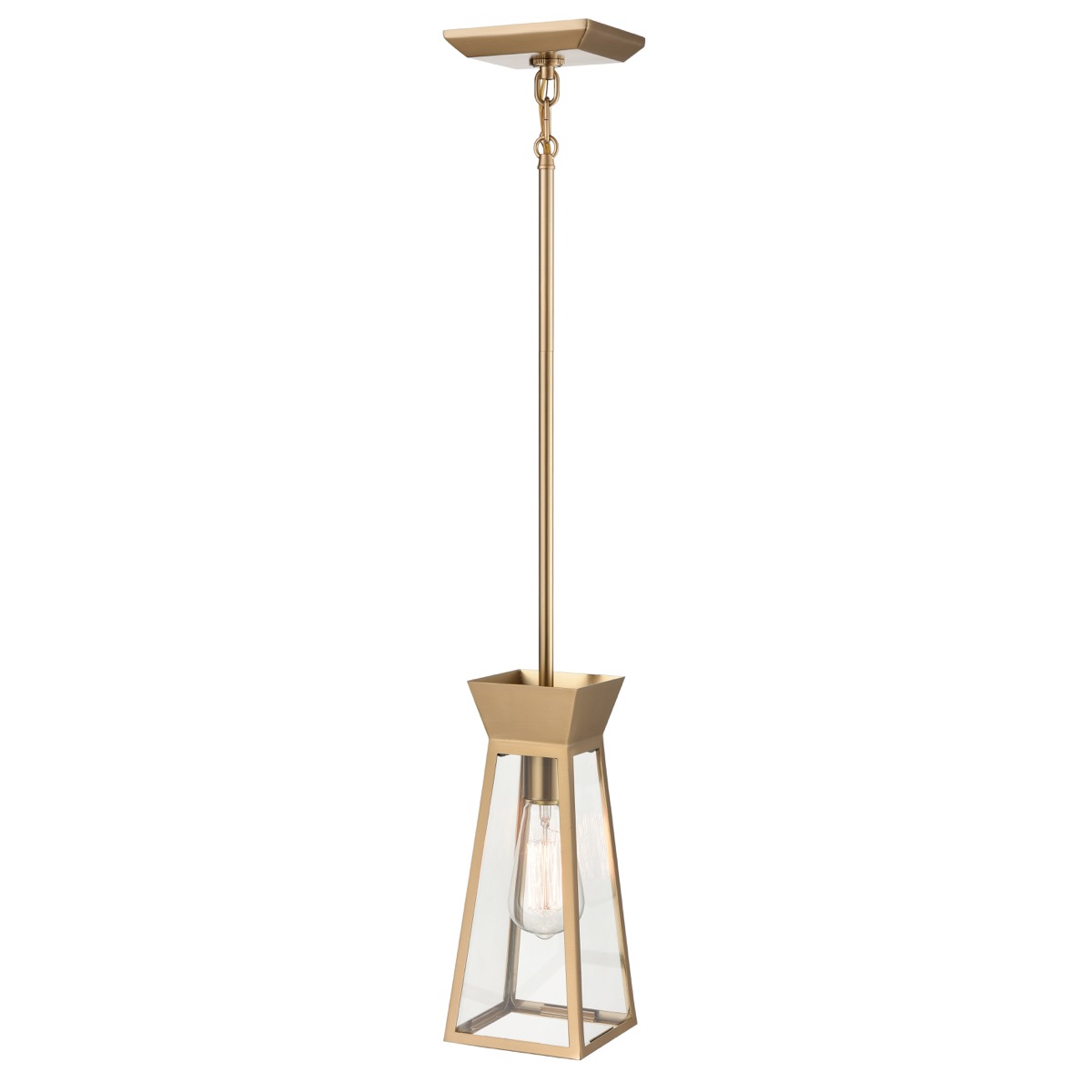 The Lucian Collection, plated in brushed brass imparts a warm and timeless aesthetic, characterized by a soft, golden hue that adds a touch of elegance to any surrounding. The metal frames encase clear glassware on each side. The model shown is a height adjustable single pendant. (By designer Kevin Kraemer)