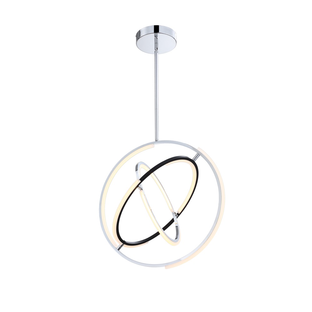 Designed by Kevin Kraemer, the orbs from the Trilogy collection are stunning. High quality polished nickel frames with black accents - illuminated by LED on certain parts of the framing. These orbs can be adjusted to your desired position since the spheres can be rotated. 24" diameter chandelier shown. (There is also a 32" version)