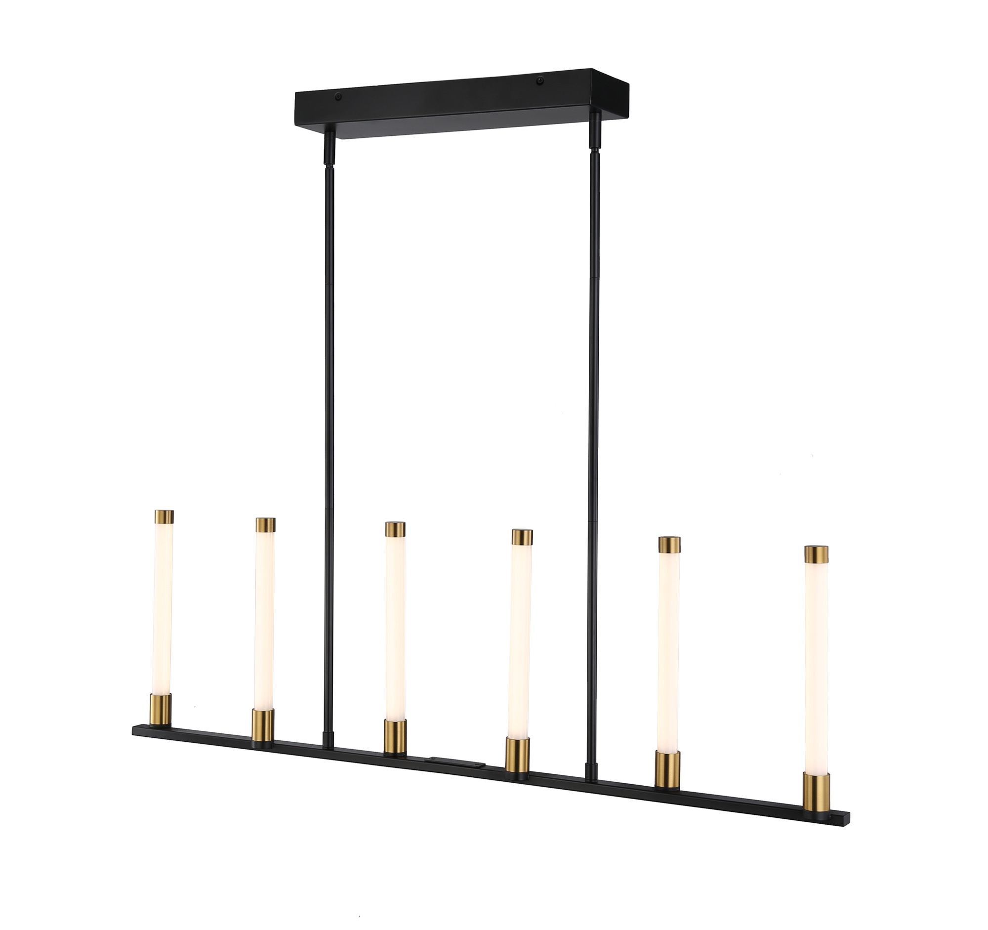 The Infiniti Collection by Steven Sabados of the S&C design firm, is stunning and quite unique. The frame is a matte black and the candle sticks are illuminated by bright energy efficient LED which have brass accents on both ends. Linear island model shown.