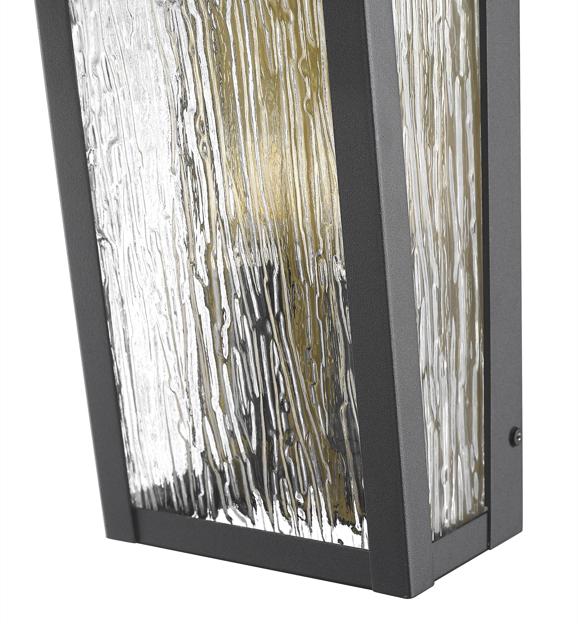 The Point collection outdoor wall sconce exudes both contemporary flair and classic allure. Its bold black frame contrasts beautifully with the warm glow of the interior brass backplate, while the rain-textured glass mimics cascading droplets, casting a soft, inviting light. Perfect for any outdoor setting, it offers both style and warmth.