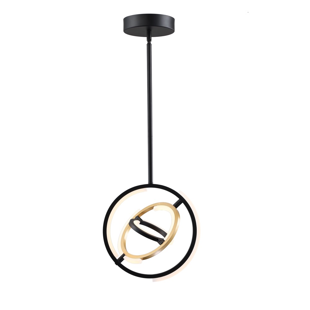 Designed by Kevin Kraemer, the orbs from the Trilogy collection are stunning. Black frames with a touch of brass - illuminated by LED on certain parts of the framing. Also these orbs can be adjusted to your desired position since the spheres can be rotated. Mini 13" diameter pendant shown (larger 17" pendant also available; matching chandeliers and semi flush mount also part of the collection)