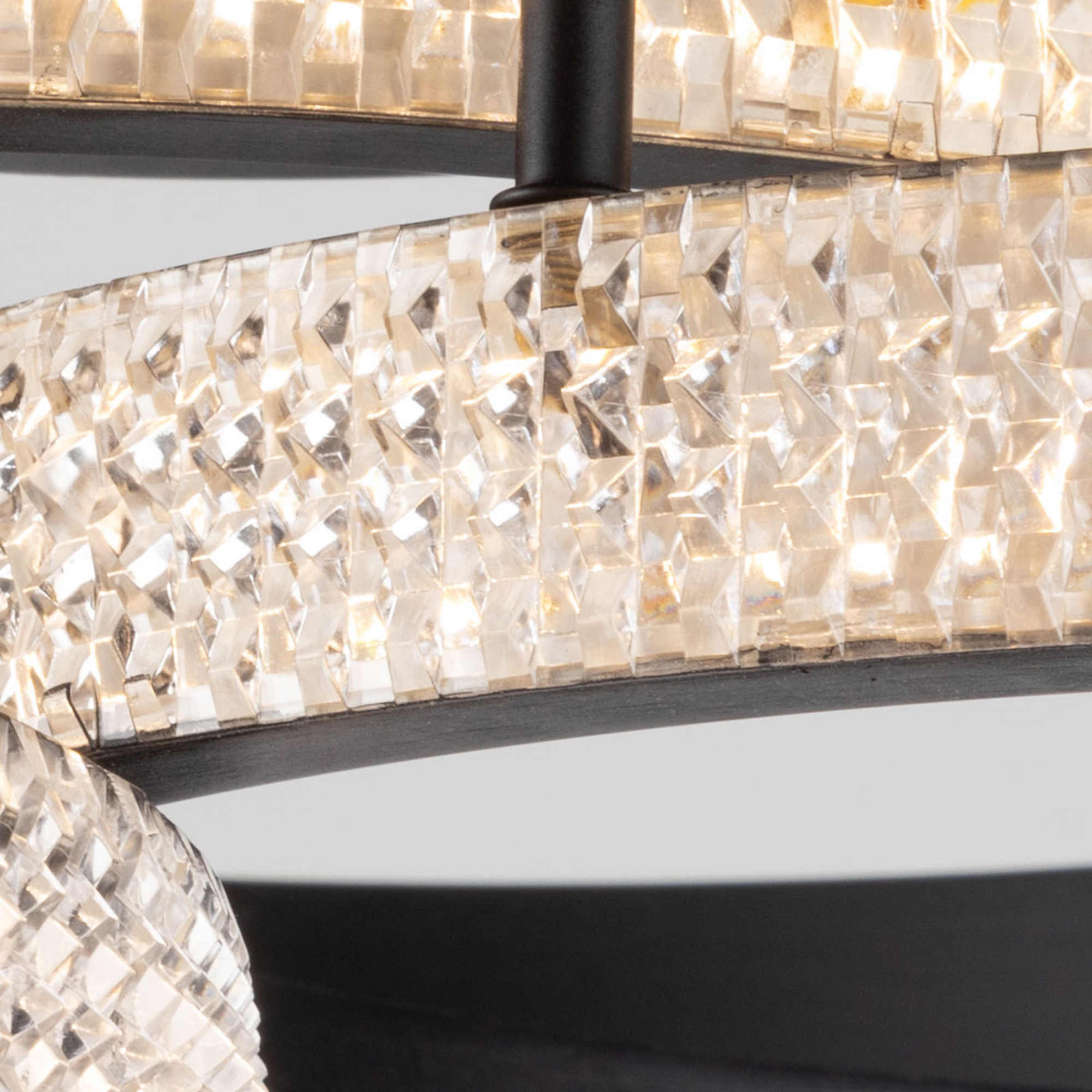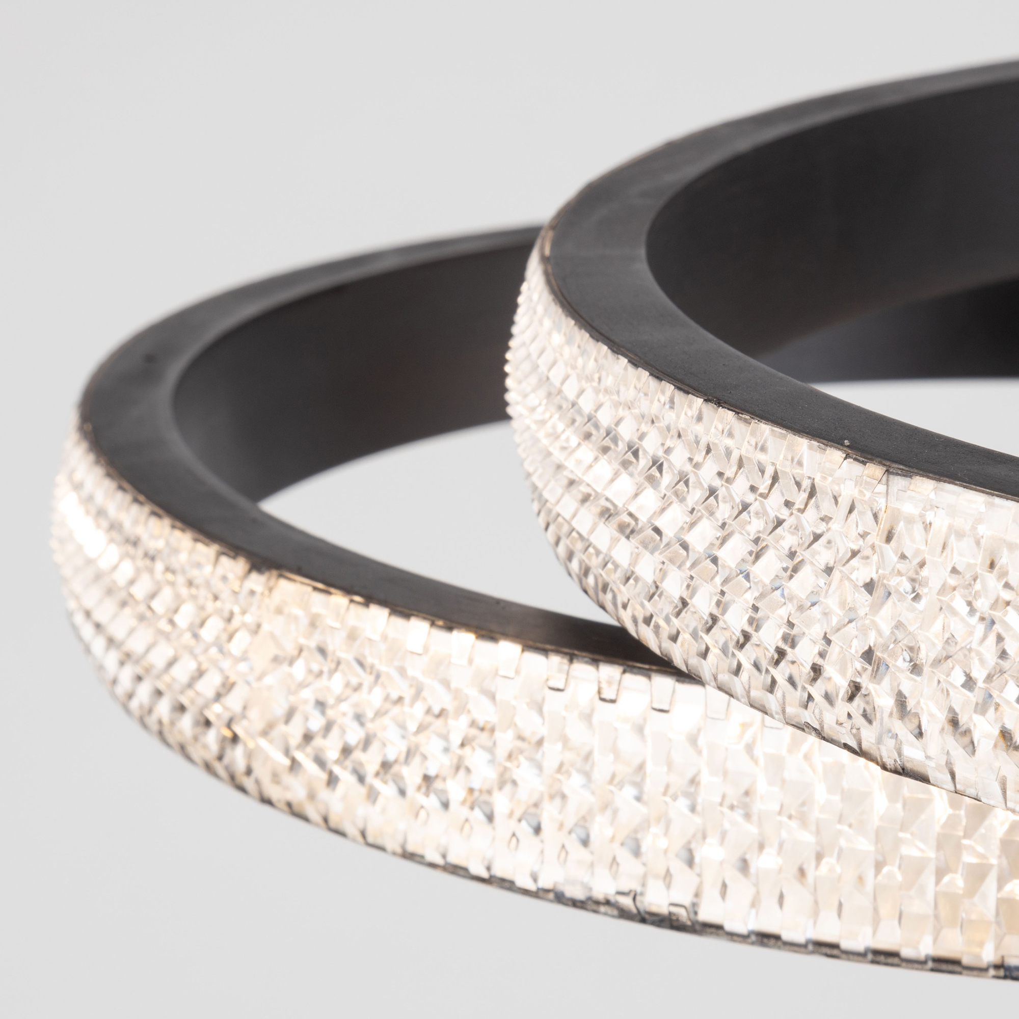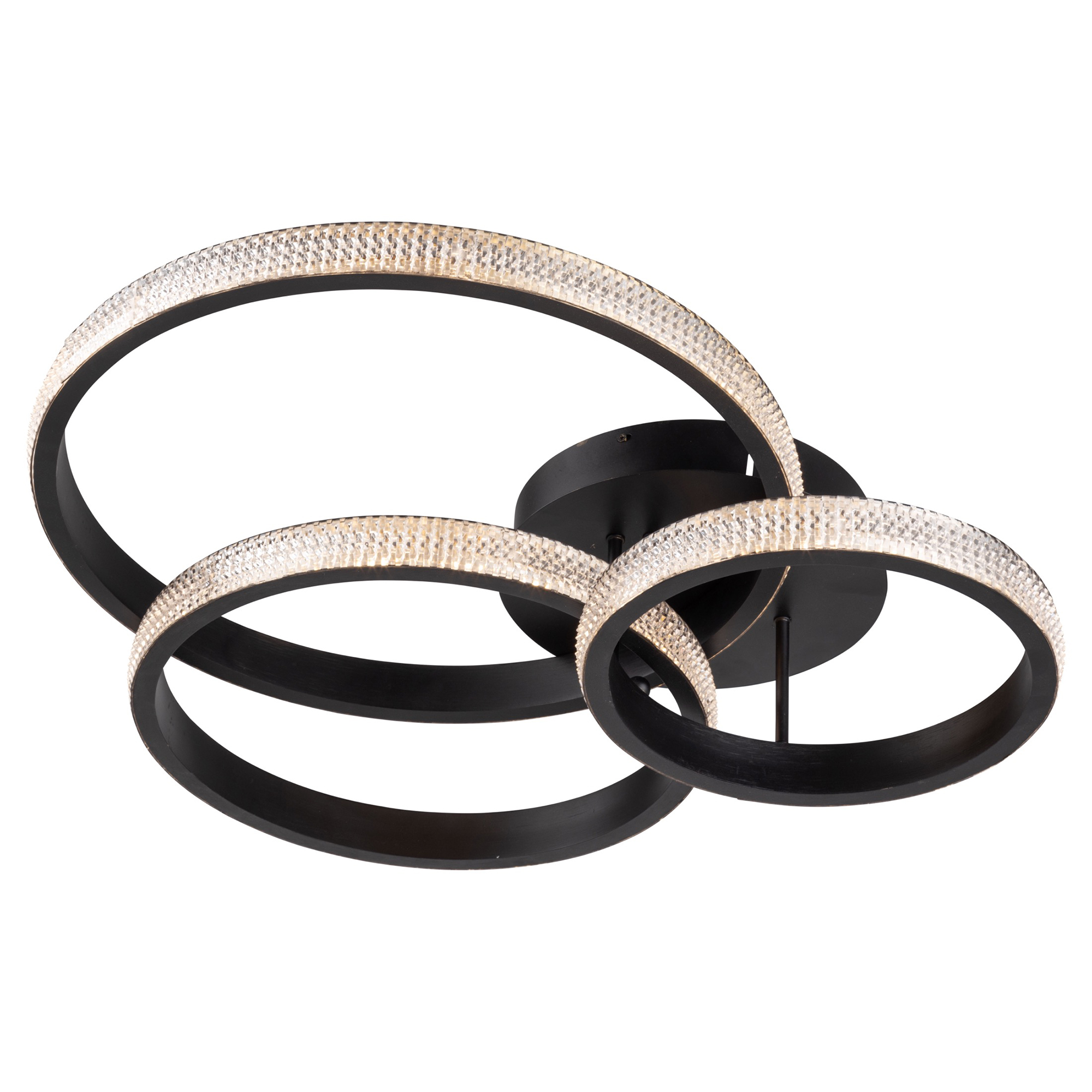 The Nova Collection three ring canopy sparkles from edge to edge. For a unique look each ring has a different diameter - large, medium then small. The interior of the ring and caopy are finished in a luxurious matte black. This product is illuminated by bright energy efficient LED which are dimmable.
