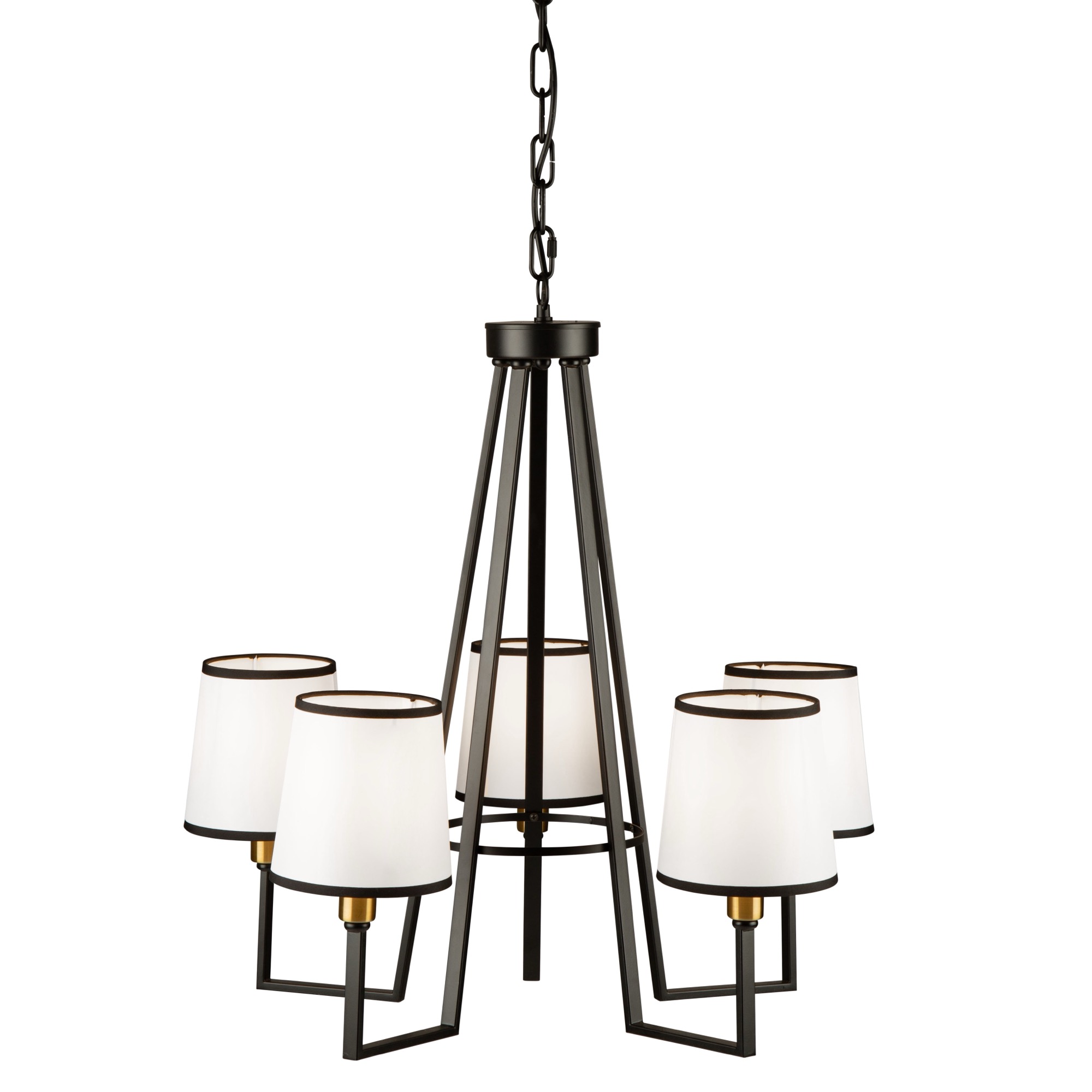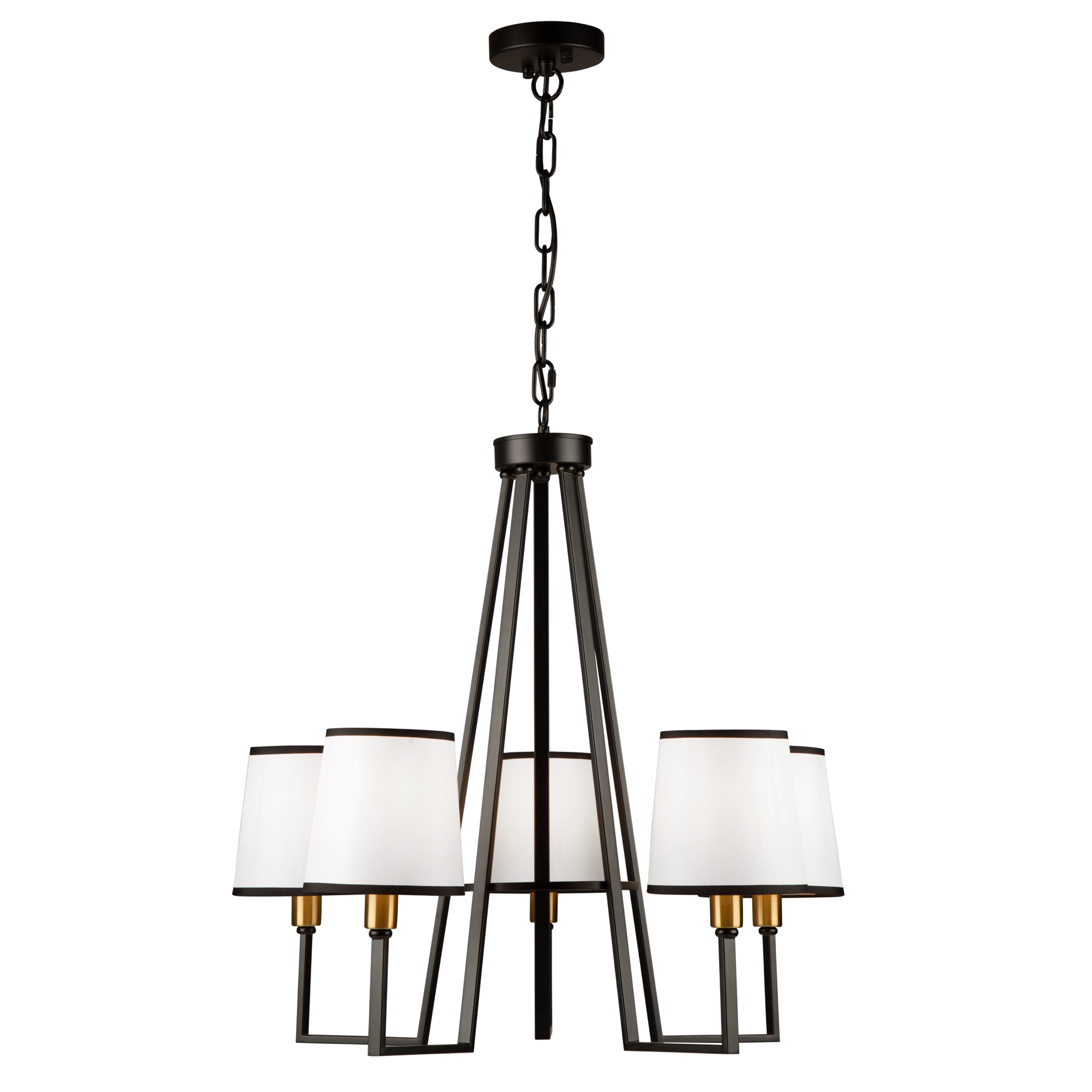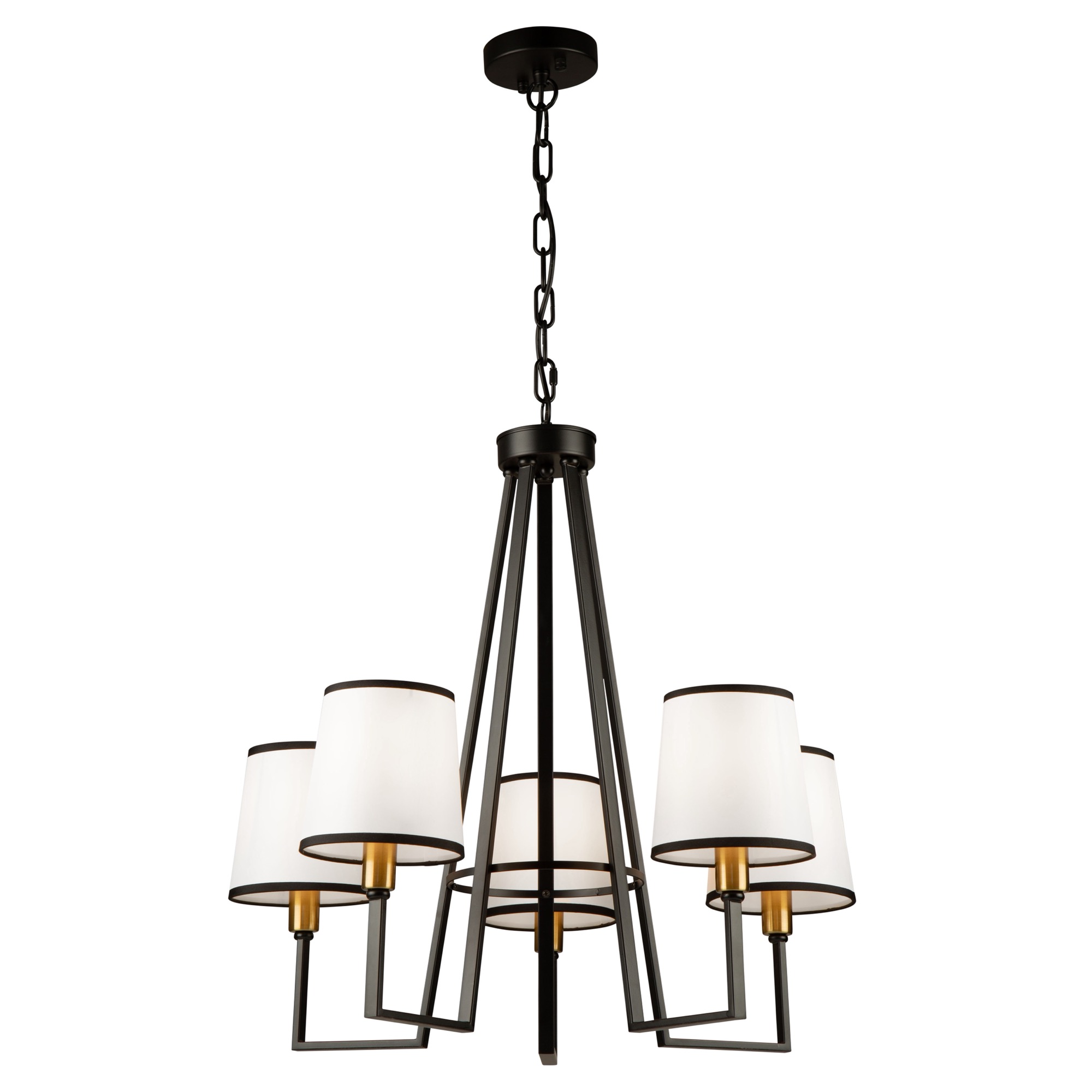 From the S&C design firm, with strict direction from Steven Sabados, the Coco Collection of chandeliers features a transitional frame which has flat type arms. The frame is finished in a rich matte black, and has harvest brass accents. The hardback white linen shades are complimented with upper and lower black trims to finish off the design. Make a statement in your home.