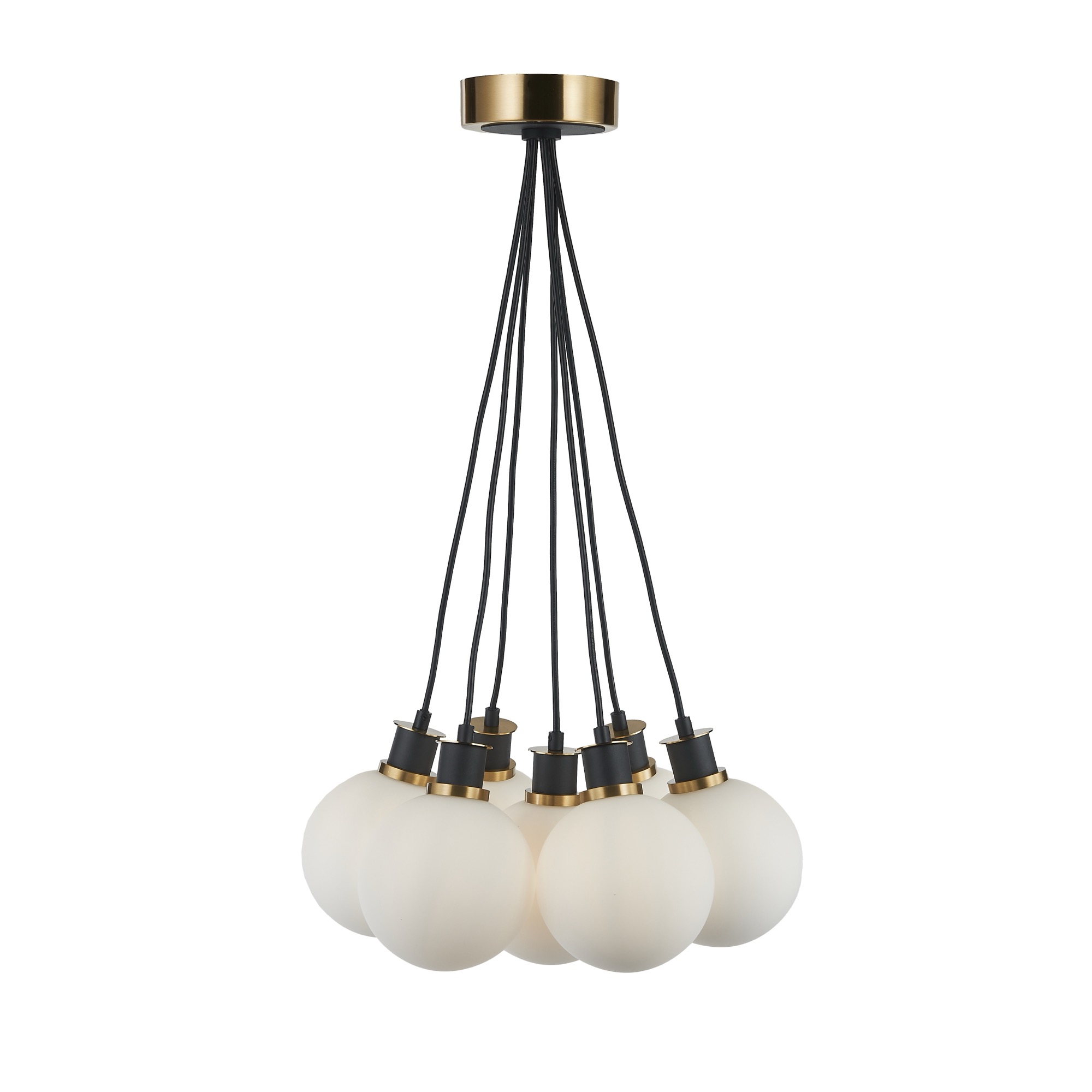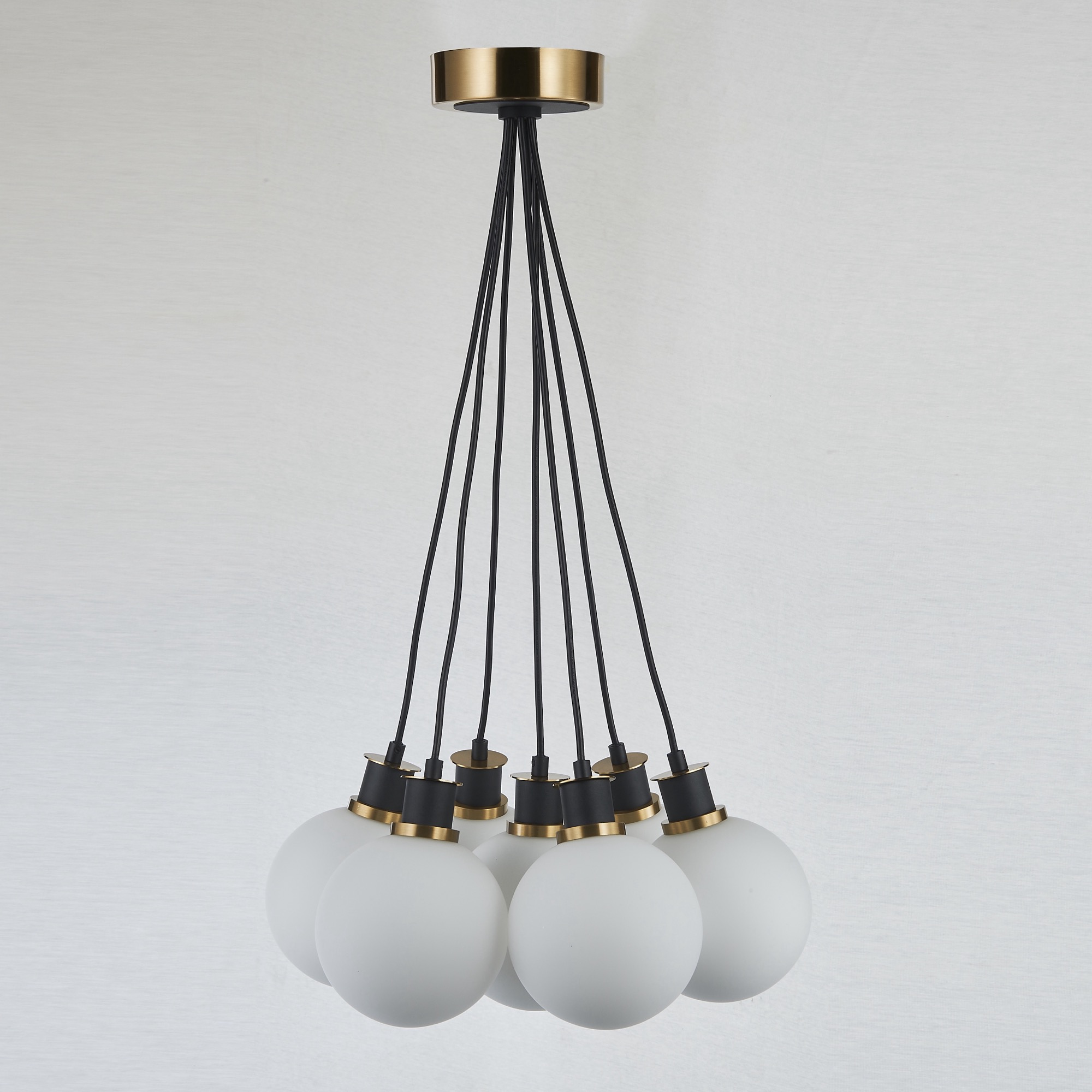 The Gem collection with acid white glass, also known as etched glass, is a type of glass that has undergone a process to give it a rich cloudy white appearance. When illuminated this glassware has a warm hue, which compliments its two-tone black and brushed brass framing. The model shown is a 7 lite height adjustable cluster type chandelier.