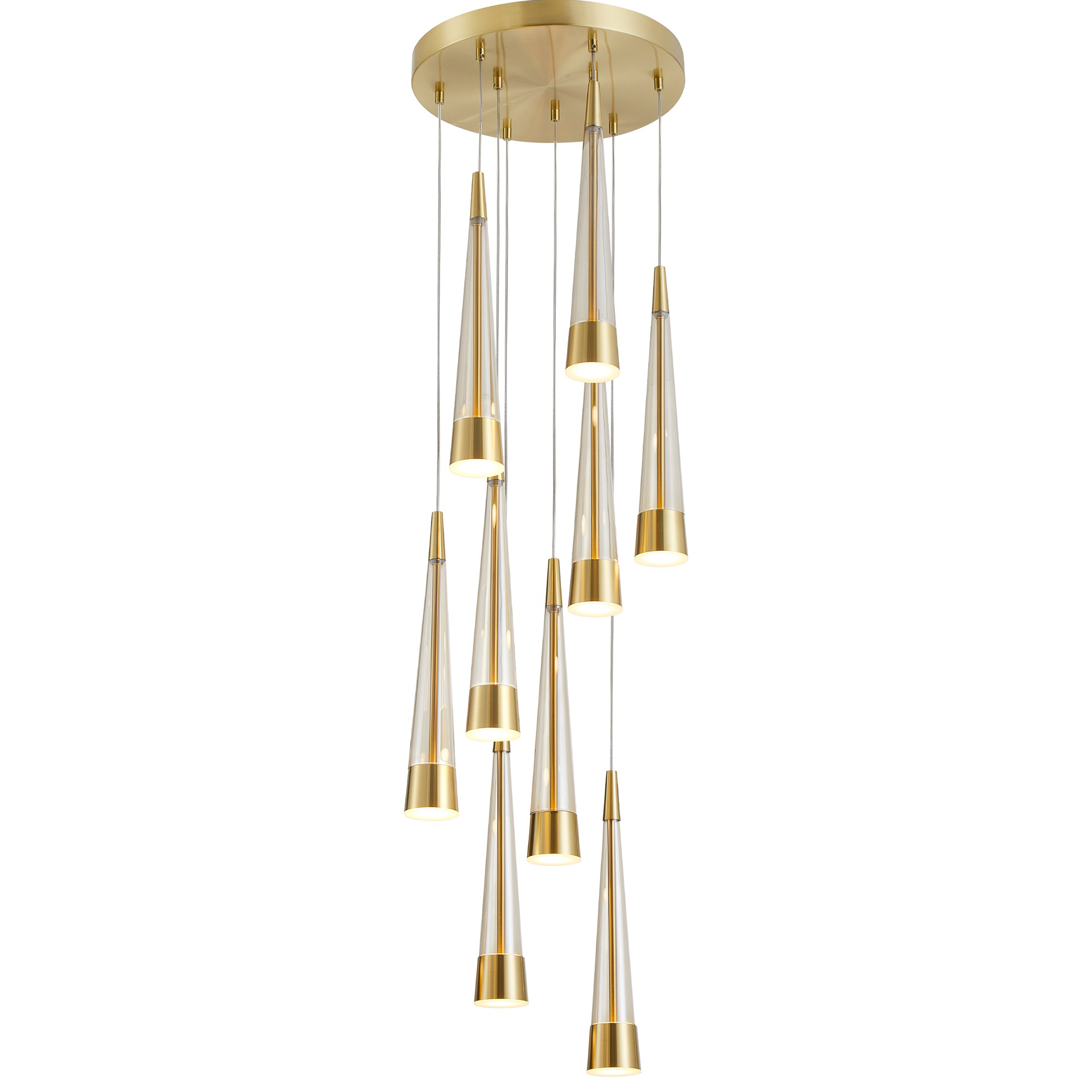 The Sunnyvale collection boasts a distinctive cone-shaped design adorned with metalwork on both the top and bottom, enveloping a captivating tea stain tinted center glass complimented with brushed brass framing. The pendant's exquisite craftsmanship and attention to detail result in a contemporary yet elegant aesthetic, making it a standout piece in any interior. With LED illumination seamlessly integrated throughout the glassware, the Sunnyvale collection not only delivers striking visual appeal but also provides efficient and ambient lighting. 9 light foyer model shown. (easily height adjustable)