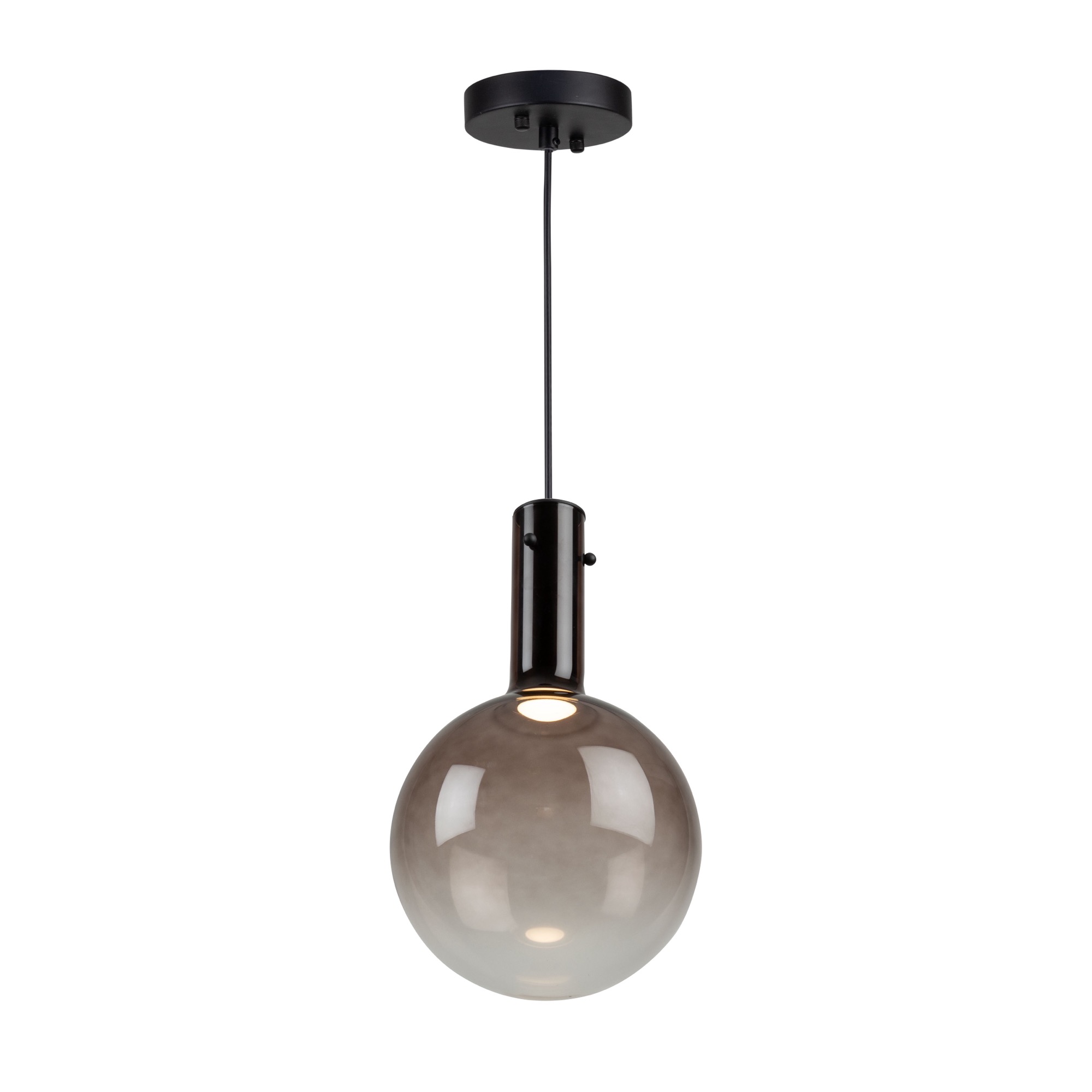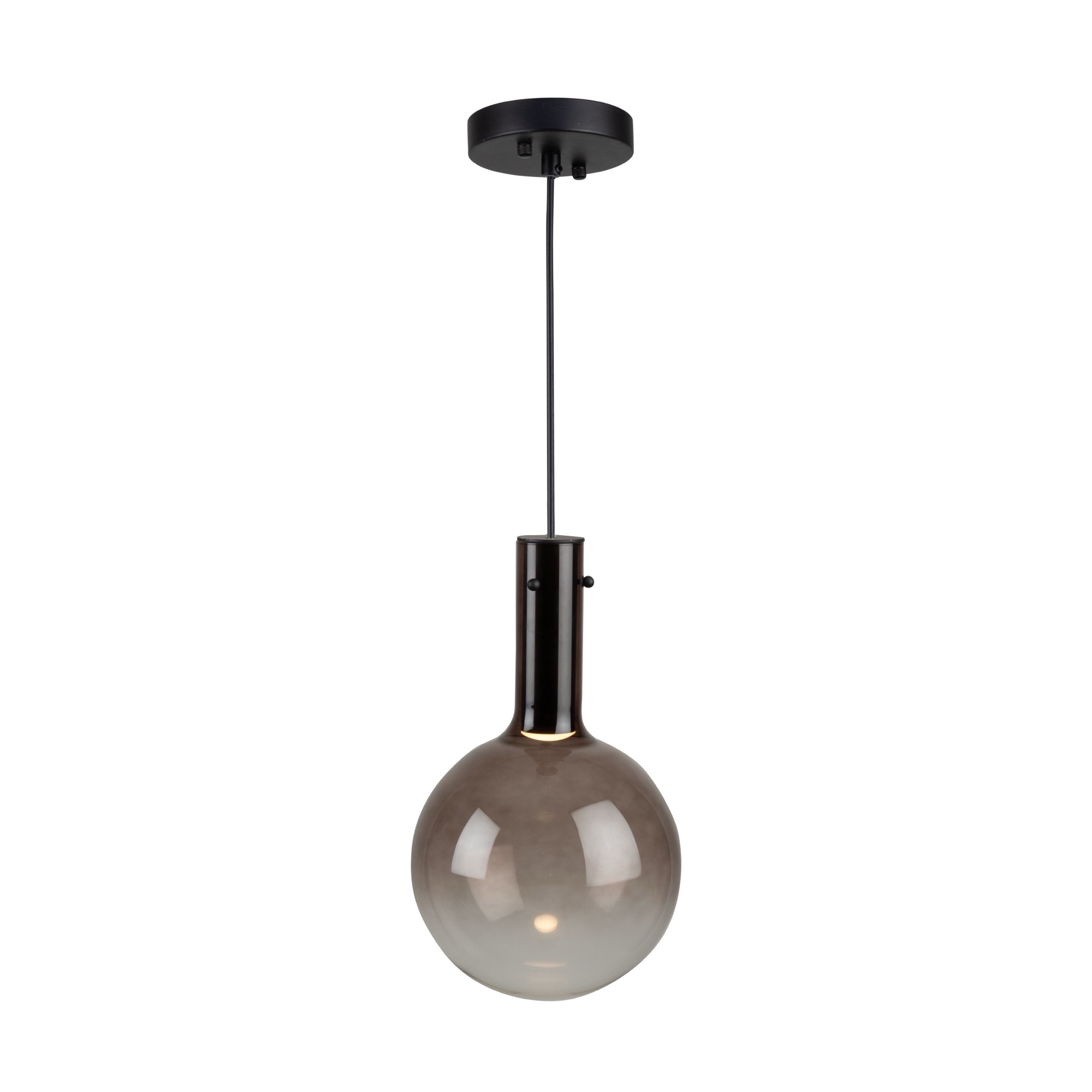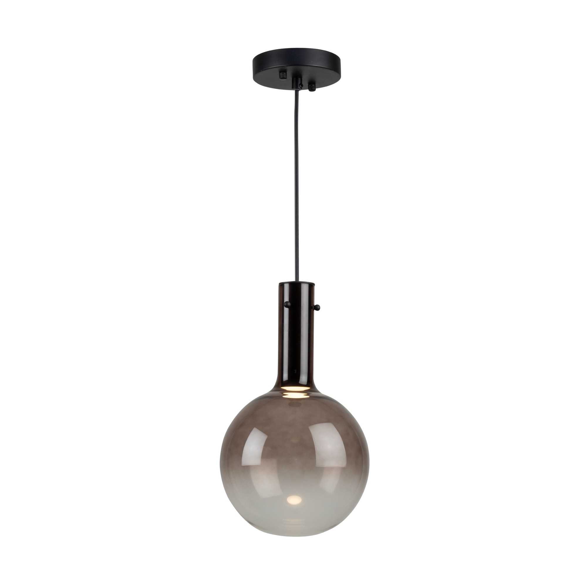 The Alexis pendant collection showcases a stunning design with spherical ombre-type glassware, featuring a captivating gradient of color that transitions seamlessly from vibrant hues at the top to a clear bottom. The Alexis is enhanced by energy-efficient LED illumination, providing a contemporary and visually striking addition to any space. Shown in coffee (also available in chrome, gold, or blue). (Easily height adjustable)
