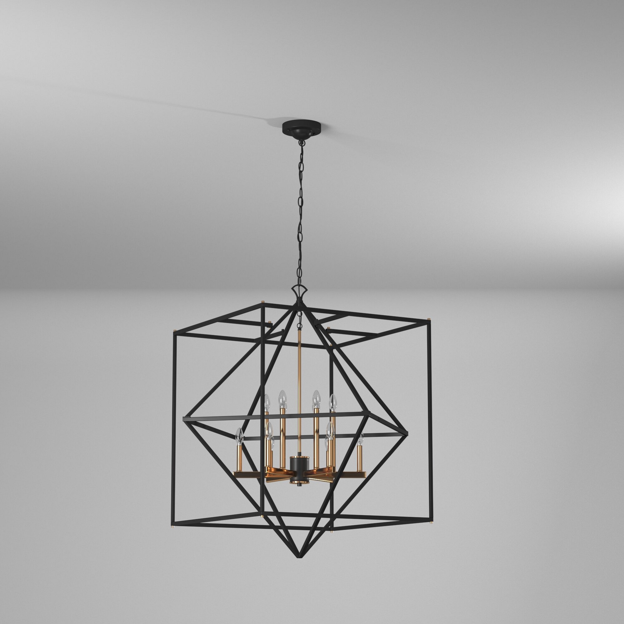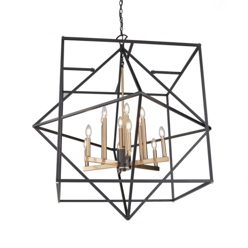 DESCRIPTION : Linear in design, the Roxton collection is comprised of a matte black exterior cage which a diamond within a square that encases a harvest brass inner chandelier cluster. 12 light shown (smaller versions available)
