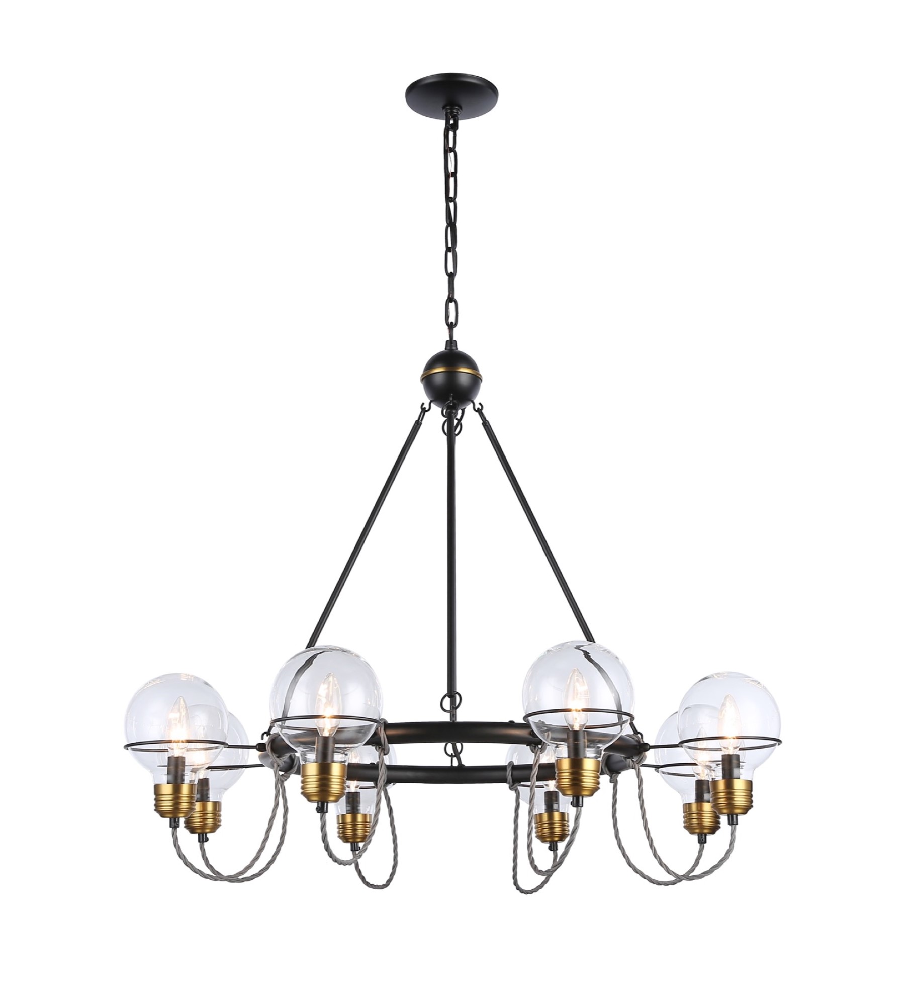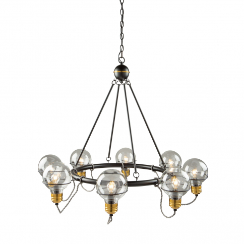 DESCRIPTION : The "Martina Collection" is so unique from a design stance. The glass is actually shaped as a bulb and the bottom glass holder is designed like the bottom of a vintage screw type bulb. The wiring has a "vintage" element since it is twisted the way Thomas Edison first introduced the bulb. The metal work is black while the glass holder is brass. The large chandelier model is shown; there are many matching units available.