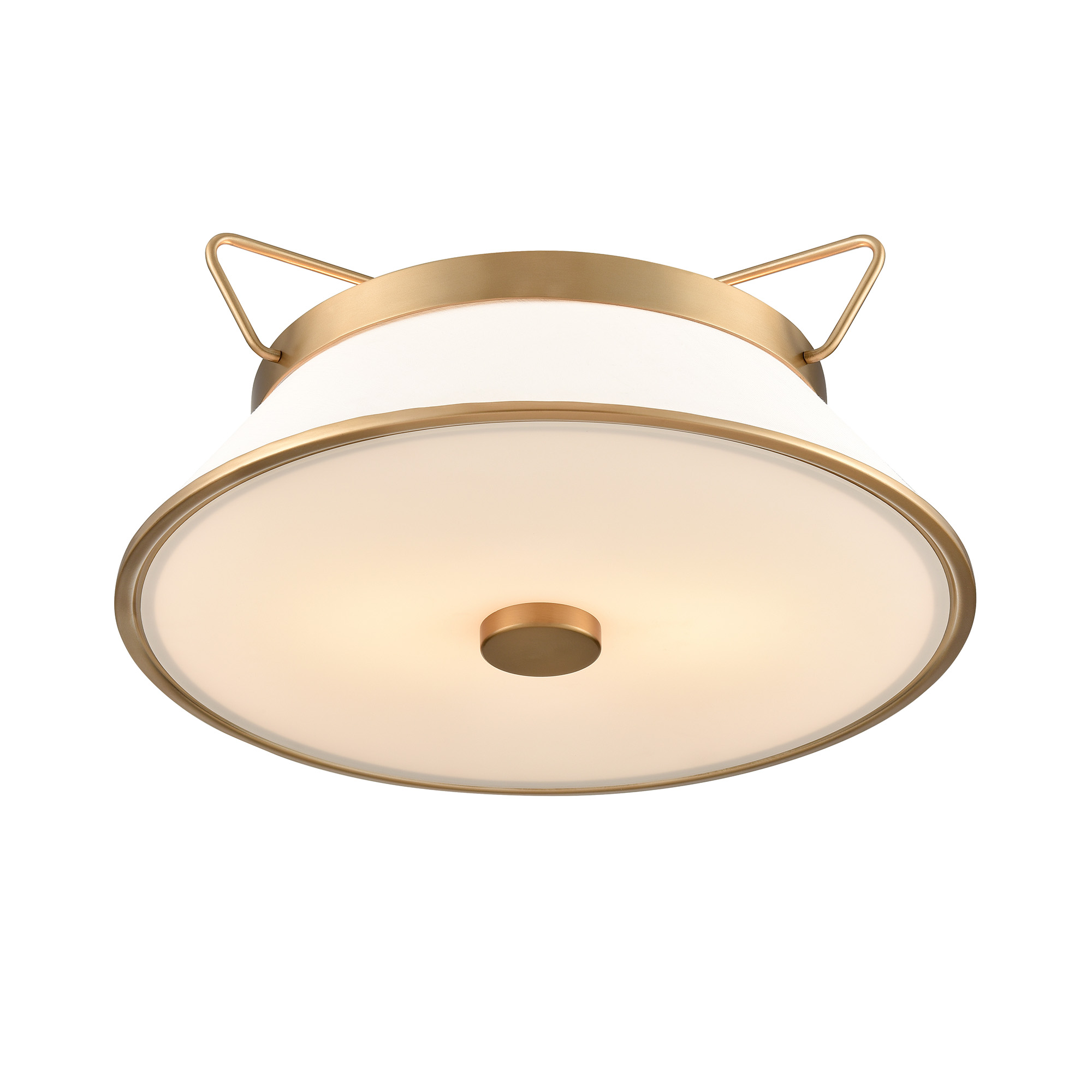The Layla collection, designed by Kevin Kraemer, features a rich plated brushed brass finished frame, which holds the linen shades in a unique fashion. Semi flushmount model shown.
