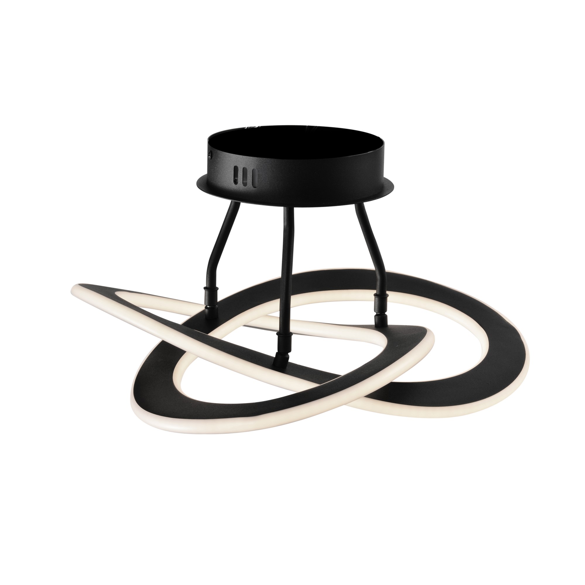 DESCRIPTION : The "Wave Collection" is named after its curvy organic design. A perfect addition to any modern to transitional setting. The chandelier is finished in a semi gloss black and is suspended by aircraft type cables. It is illuminated by bright energy saving LED technology. This semi flush has two sizes of matching chandeliers.