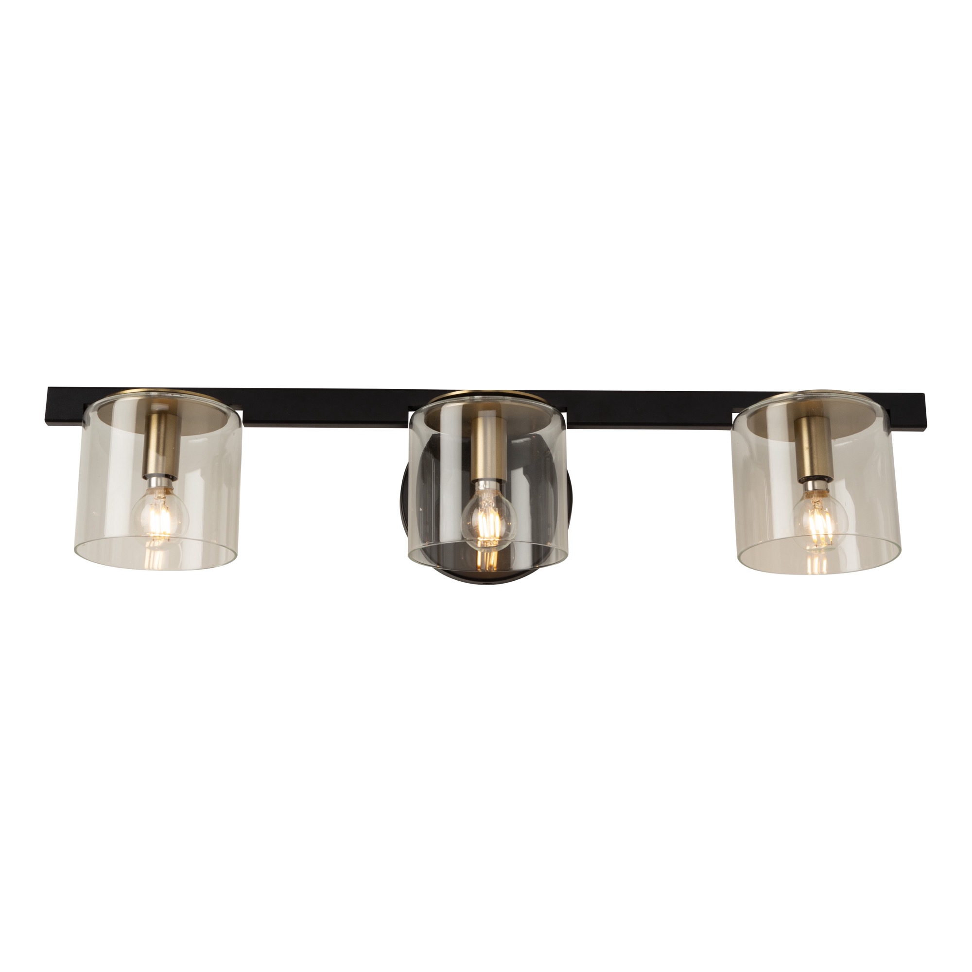 The Salinas Collection by designer Kevin Kraemer, has black frames complimented with brushed brass candles covered by clear cylinderical glassware. 3 lite vanity model shown
