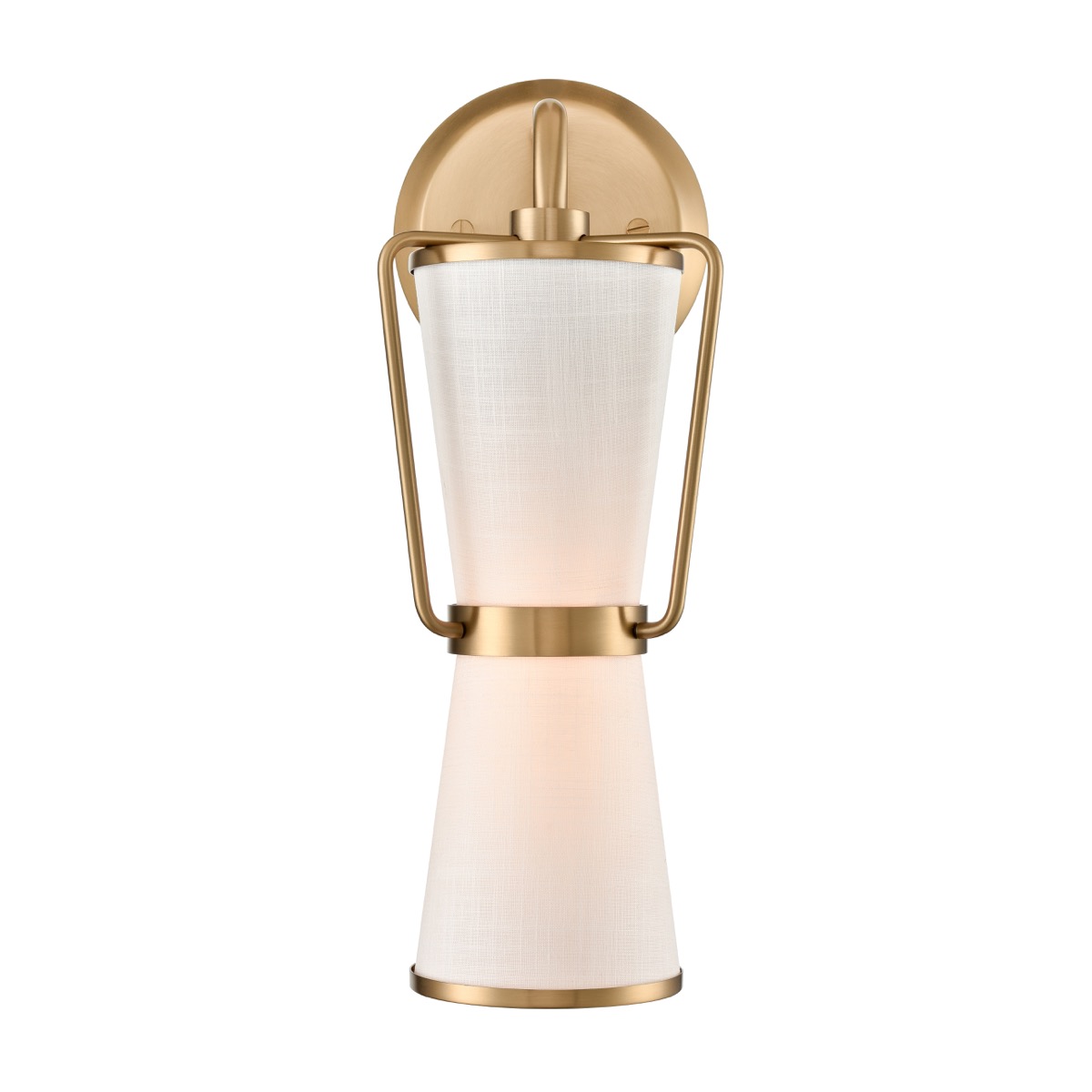The Layla collection, designed by Kevin Kraemer, features a rich plated brushed brass finished frame, which holds the double linen shades in a unique fashion. The model shown is a wall sconce. Great for any area of the home - hallway, dining room, bedroom etc..